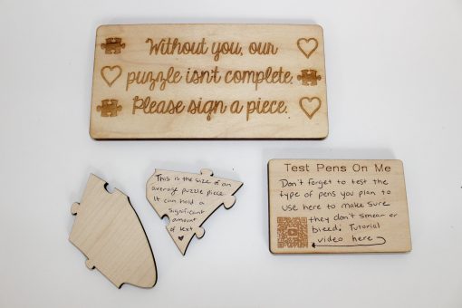 All of the puzzles are cut from quality 1/4″ thick maple plywood. A blank piece of wood is included with every order for you to test different pens on. Some pens work good for writing on the pieces and others don’t. A lot has to do with the climate you’re in. We’ve found regular bic or ball point pens to work well without bleeding. Fine tip sharpies typically do not bleed, but sometimes they do. Regular sharpies typically bleed. Test different pens out and see what works best for you in your climate.